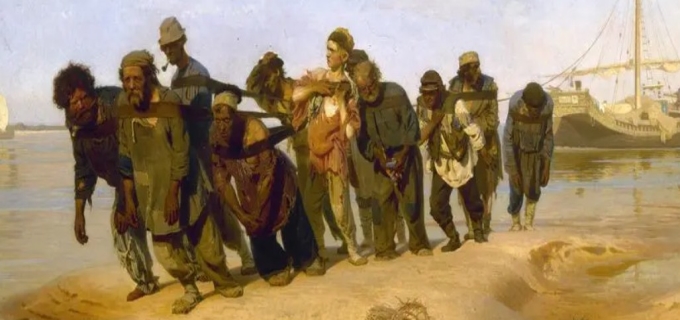 3.伏尔加河上的纤夫,不仅仅是在拖曳着一艘旧时代的驳船,分明仍在牵引着列宾颤栗的画笔。最终,一切都间断了,不论是弓起的肩背、蹒跚的步履,依旧是愈来愈显得厚重的祖国。画布上弥漫着历史悠久的喘息,而绷紧的纤,简直即将长进肉里。俄罗斯的痛苦,俄罗斯的精神,全维系在绷紧的绳子上。